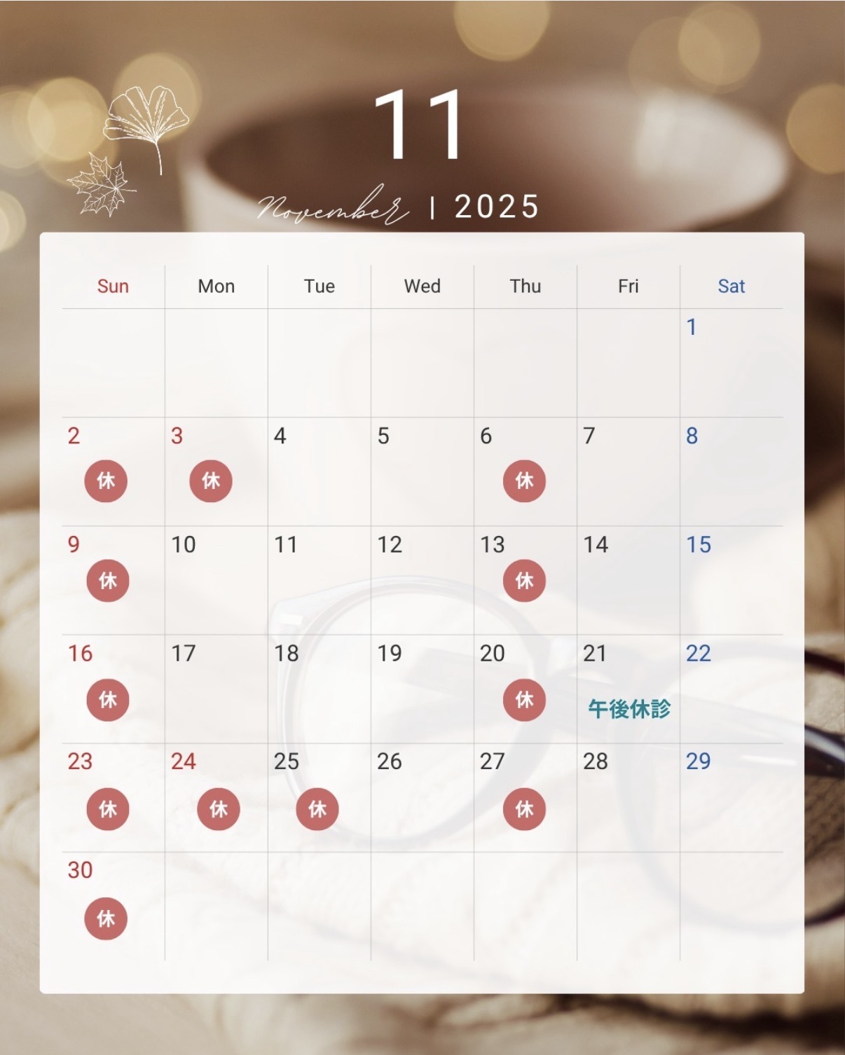 | 2025/11/06 | 11月の診療日および休診日をお知らせいたします。 詳細は右のカレンダーの通りです。 ★木曜日、日曜日、祝日は休診です。土曜日は午前の診療のみです。 ★11月臨時休診日は、14日(金)の午後、25日(火)です。 |