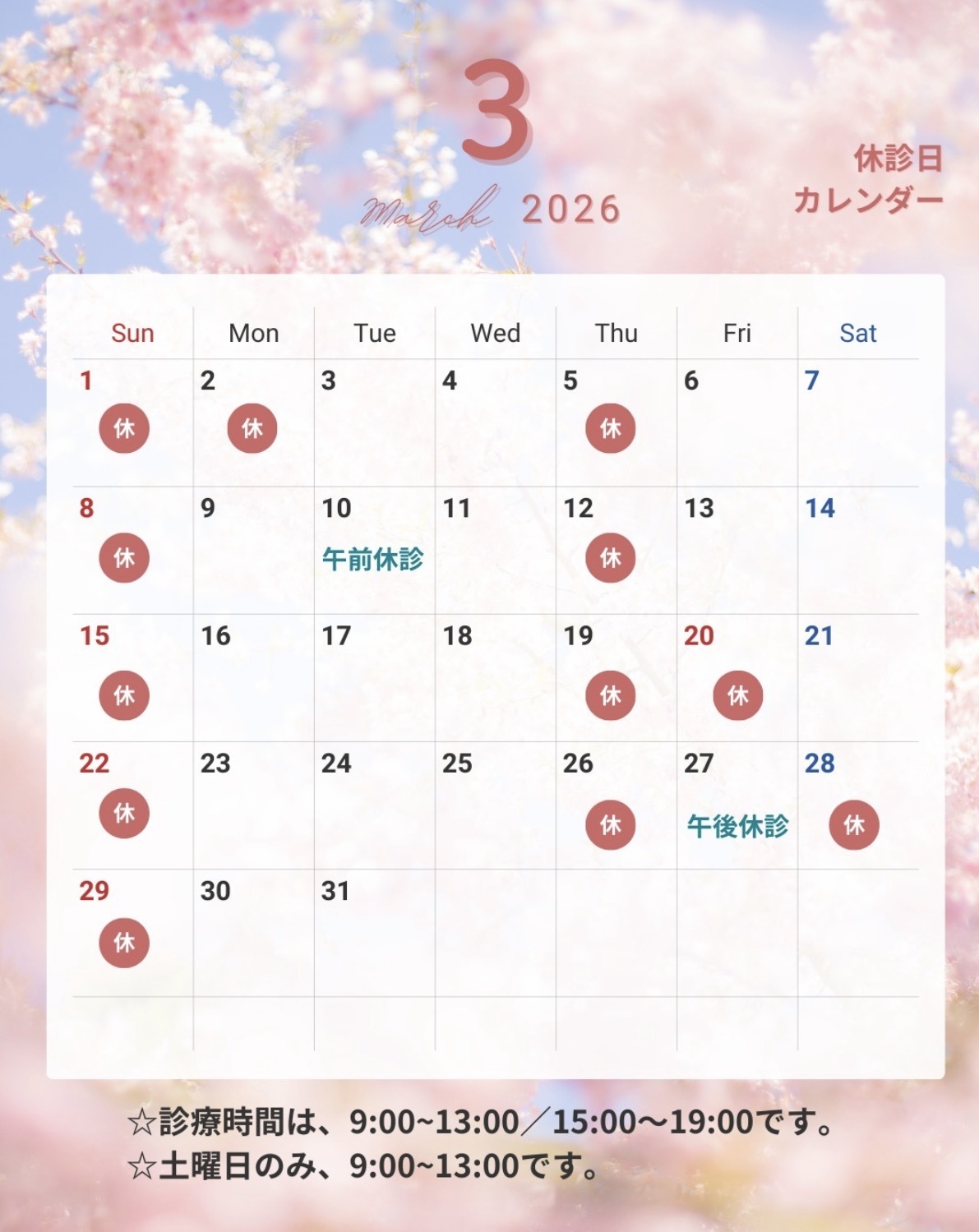 | 2026/3/1 | ★令和8年(2026年)3月の診療日および休診日、詳細は右のカレンダーの通りです。 ★3/2(月)、3/28(土)は休診です。 ★3/10午前は休診です。午後は診療いたします。 ★3/27(金)午後は休診です。午前は診療いたします。 ★木曜日、日曜日、祝日は休診です。土曜日は午前のみの診療です。 |